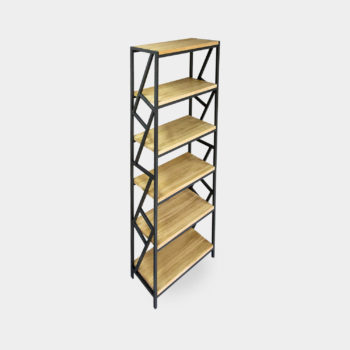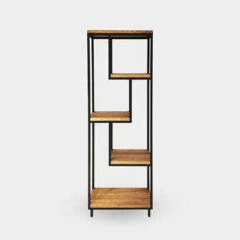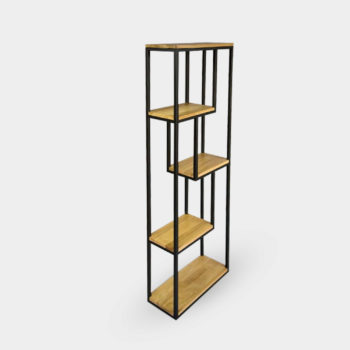 Regał posiada wykonaną ze stali ramę malowaną w kolorze czarny mat. Półki wyłożone deską dębową oraz wypełnione czterema dębowymi kubikami.