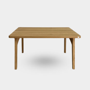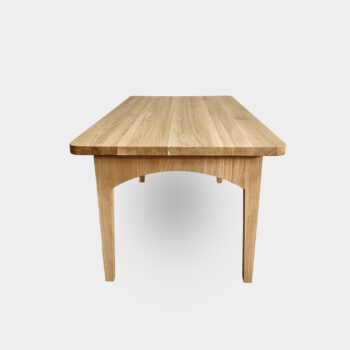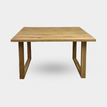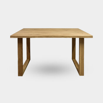 Stół wykonany z połączenia dębowego blatu wspartego na nogach w kształcie „X”.