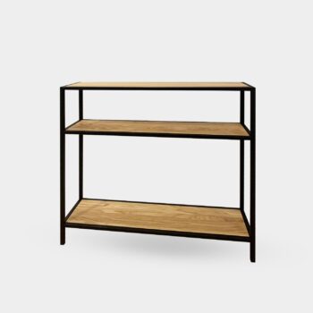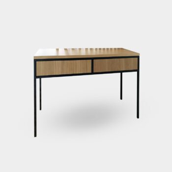 Konsola wykonana z litego drewna dębowego wspartego na stalowej konstrukcji. Dwie szuflady otwierane na dotyk, w systemie ”naciśnij i otwórz ” z dodatkową półką na dole. Całość zabezpieczona matowym lakierem bezbarwnym lub olejowana. Stal malowana proszkowo w kolorze czarny mat. Istnieje możliwość pomalowania na inny kolor i wykonanie innego wymiaru.