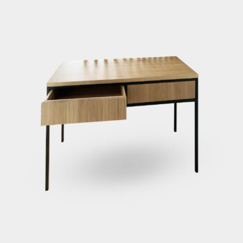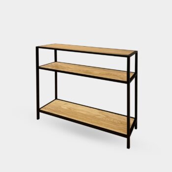 Konsola wykonana z litego drewna dębowego wspartego na stalowej konstrukcji. Dwie szuflady otwierane na dotyk, w systemie ”naciśnij i otwórz ” z dodatkową półką na dole. Całość zabezpieczona matowym lakierem bezbarwnym lub olejowana. Stal malowana proszkowo w kolorze czarny mat. Istnieje możliwość pomalowania na inny kolor i wykonanie innego wymiaru.