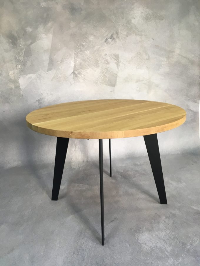 Stół wykonany z połączenia blatu dębowego wspartego na stalowej konstrukcji. Model ten charakteryzuje się czterema stalowymi nogami z solidnej grubej blachy.