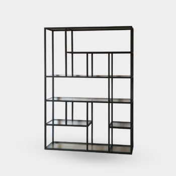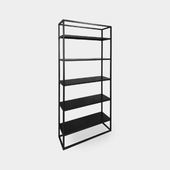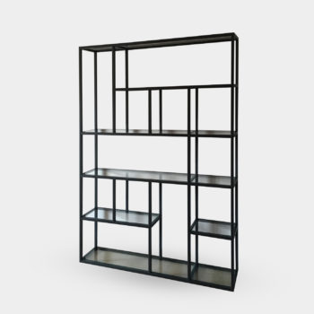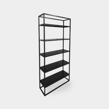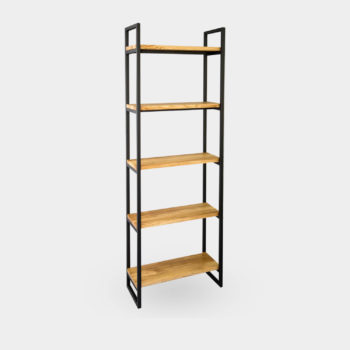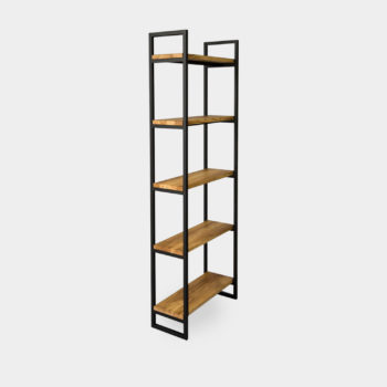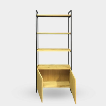 Regał posiada wykonaną ze stali ramę malowaną w kolorze czarny mat. Półki wyłożone deską dębową oraz wypełnione czterema dębowymi kubikami.