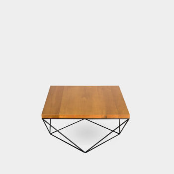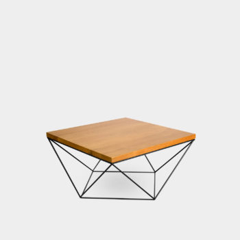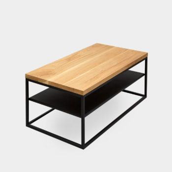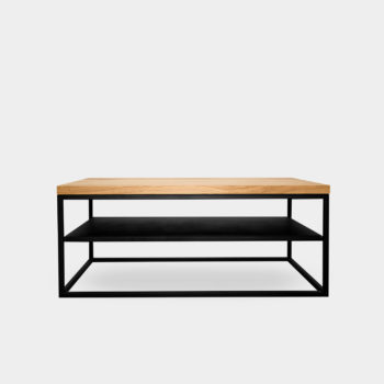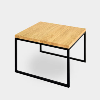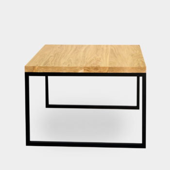 Ława wykonana z połączenia dębowego blatu wspartego na stalowej ramie na planie równoległoboku.