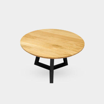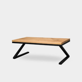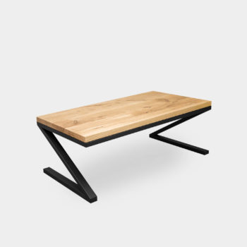 Ława wykonana z połączenia dębowego blatu wspartego na dwóch grubych stalowych nogach na planie trapezu zwężającego się ku dołowi, połączonych ze sobą pod blatem w jedną ramę.